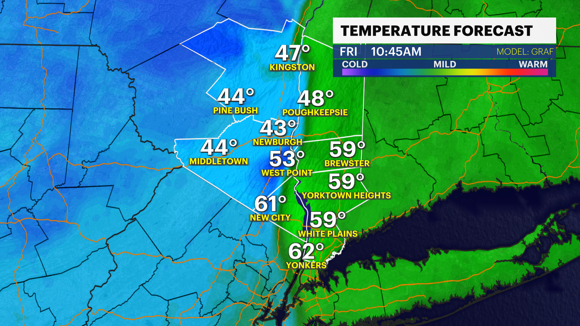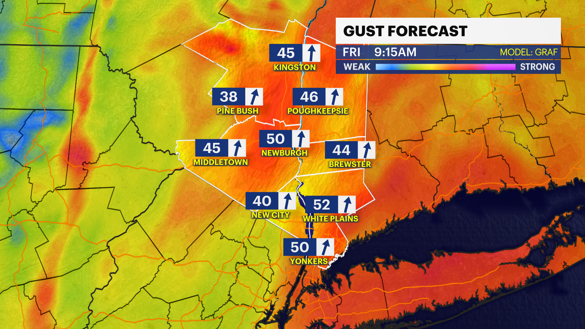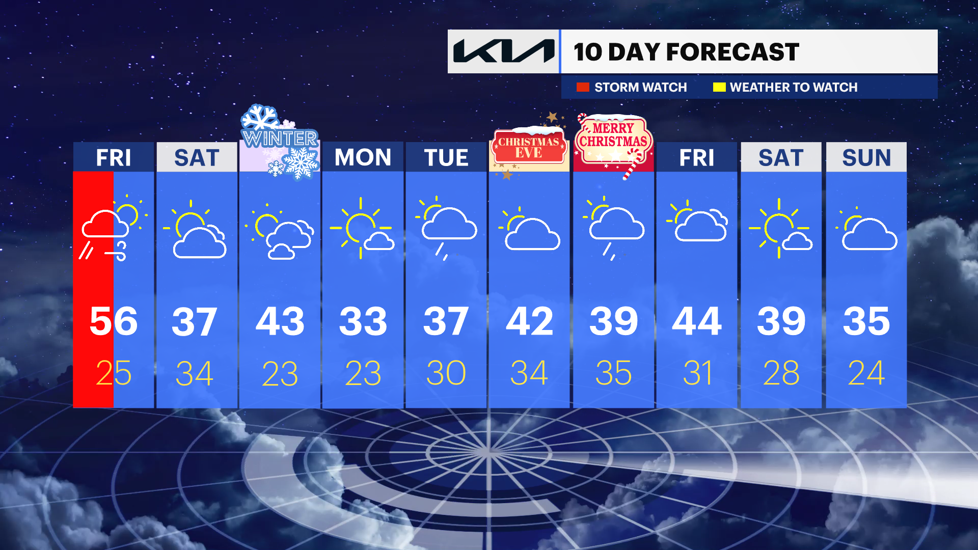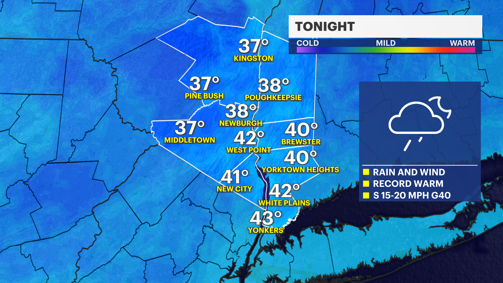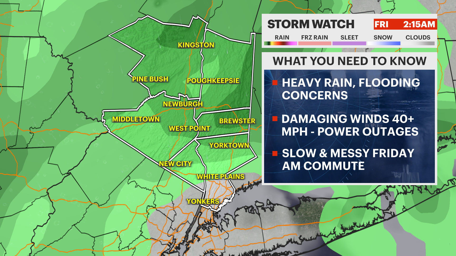 FRIDAY : STORM WATCH: Rain continues into the morning, possibly heavy at times, before ending midday. Windy conditions persist, with temperatures starting in the low to mid-50s before falling into the low to mid-40s by the afternoon.